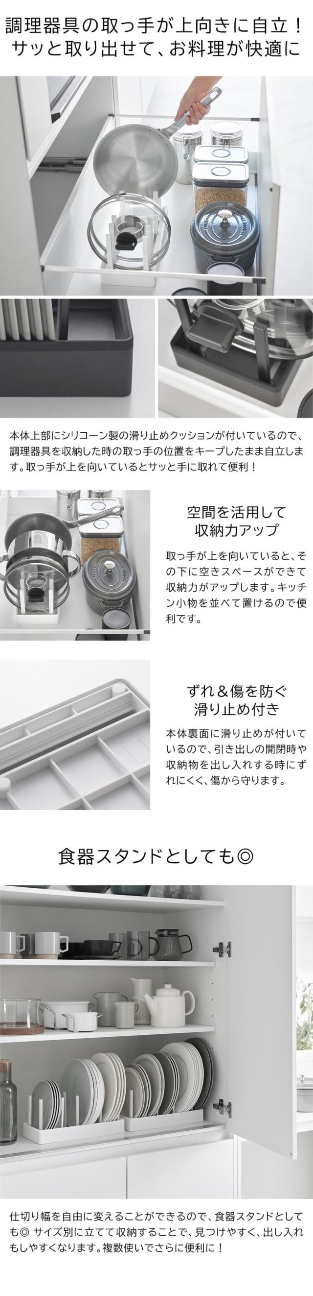 鍋蓋やフライパンのサイズに合わせてスライドできる可動式の仕切りバーが便利な幅32cmの収納スタンド。シリコーン製の滑り止めクッションが付いているので、フライパンなど収納時の取っ手位置のまま自立してくれます。製品の裏面にも滑り止めが付いているので、引き出しの開閉時にずれにくくキズから守ります。仕切り幅を自由に変えることができるので、食器スタンドとして食器棚への設置もおすすめです。