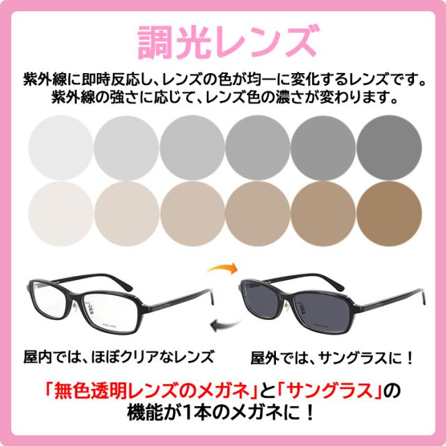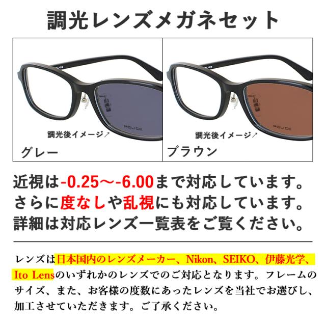 | 商品詳細 POLICE ポリス メガネ フレーム 度付き 度なし 調光メガネ 非球面レンズ メンズ レディース 男女兼用モデル ・天地浅めのスクエアシェイプ ・シーンや老若男女問わずかけていただきやすいスマートなデザイン ・クリングス鼻パッド付きで快適な掛け心地 ・すっきりとした細身のラインが洗練された印象 ・定番のブラックに加え、ほど良い抜け感のあるクリアブラウン、クリアオリーブカラーをラインナップ ・テンプルのイーグルロゴを境目にアセテートを切り替え、トーンオントーンの配色に 近眼 度数は-6.00まで対応。 乱視にも対応しています。 度なし の調光レンズ0.00にも対応しています。 詳細は、対応レンズ 一覧表をご覧ください。 調光レンズはグレー調光とブラウン調光の2カラーをご用意。 調光レンズ 「無色透明レンズのメガネ」と「サングラス」の機能が1本のメガネに! レンズに練りこまれた「調光素材」が紫外線に反応して、レンズの色が変わります。 屋内など紫外線が当たらない時はほぼクリアのレンズ。 屋外では、紫外線がレンズに当たるとレンズの色が変化し、サングラスに。 ※ご使用状況によって、調光しない場合もございます。調光レンズの特性をご確認のうえ、お買い求めお願いします | |
