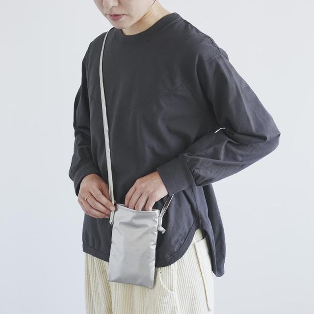 マチがなくフラットで滑らかな素材のポシェット。背面にはポケット付きで、ICカード入れとして重宝します。