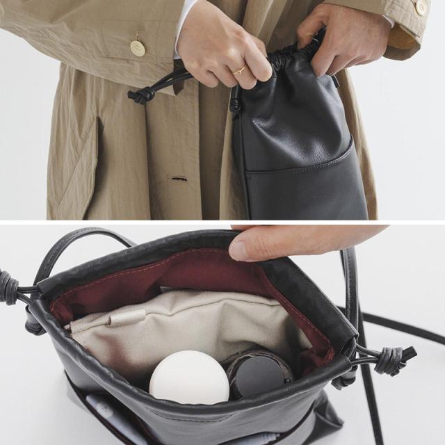 しっとりと柔らかな羊革の、巾着タイプのショルダーバッグ。カジュアルな巾着仕様でありながらシックな羊革を使うことで、大人の女性らしい、品のあるバッグに仕上がりました。