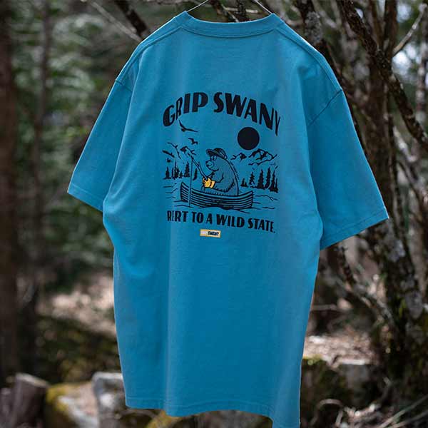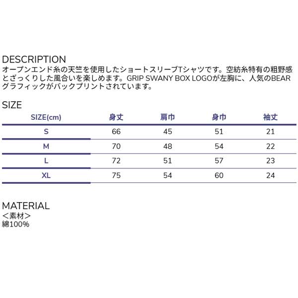 オープンエンド糸の天竺を使用したショートスリーブTシャツです。 空紡糸特有の粗野感とざっくりした風合いを楽しめます。 GRIP SWANY BOX LOGOが左胸に、人気のBEARグラフィックがバックプリントされています。 | ||||||