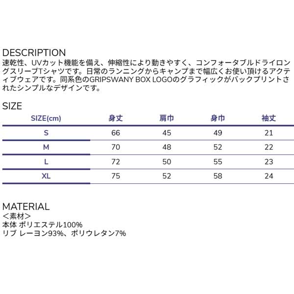 速乾性、UVカット機能を備え、伸縮性により動きやすく、 コンフォータブルドライロングスリーブTシャツです。 日常のランニングからキャンプまで幅広くお使い頂けるアクティブウェアです。 同系色のGRIPSWANY BOX LOGOのグラフィックがバックプリントされたシンプルなデザインです。 | ||||||