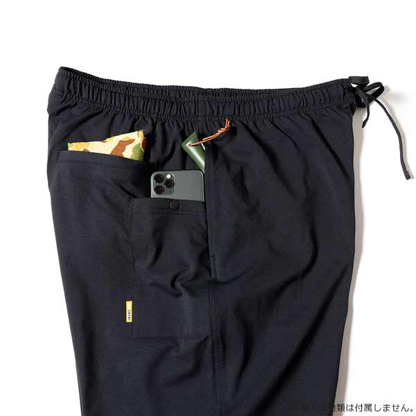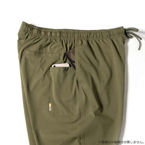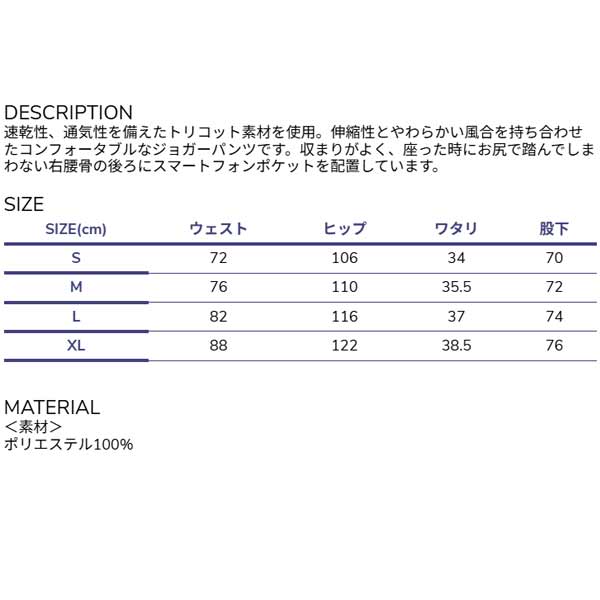 速乾性、通気性を備えたトリコット素材を使用。 伸縮性とやわらかい風合を持ち合わせたコンフォータブルなジョガーパンツです。 収まりがよく、座った時にお尻で踏んでしまわない右腰骨の後ろにスマートフォンポケットを配置しています。 | ||||||