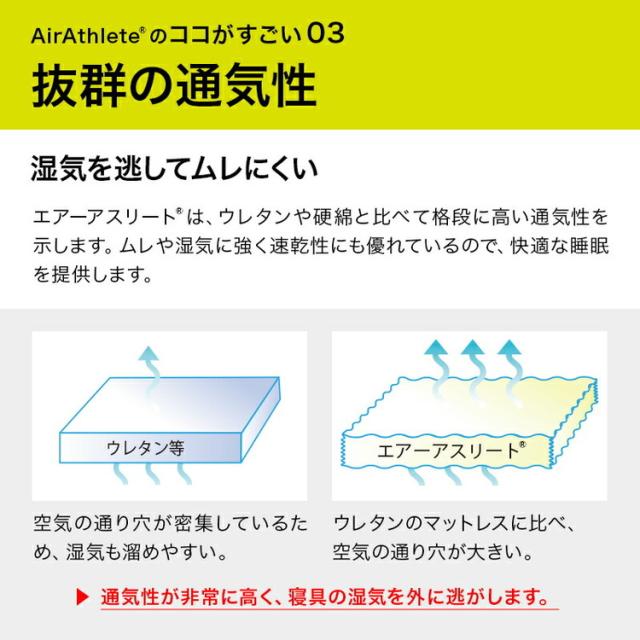 湿気を逃がしてむれにくい。エアアスリートはウレタンや固綿と比べて格段に高い通気性を示します。蒸れや湿気に強く速乾性にも優れているので快適な睡眠を提供します。