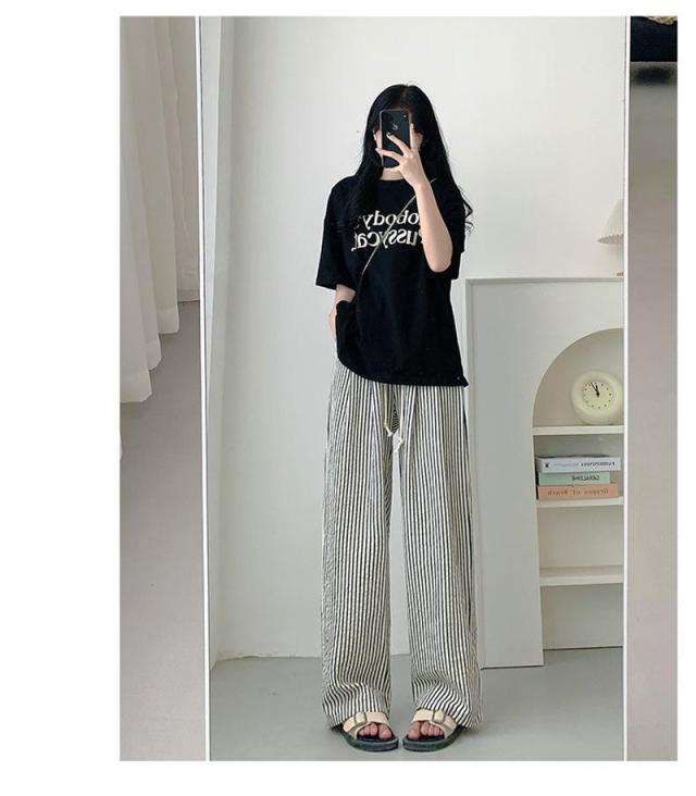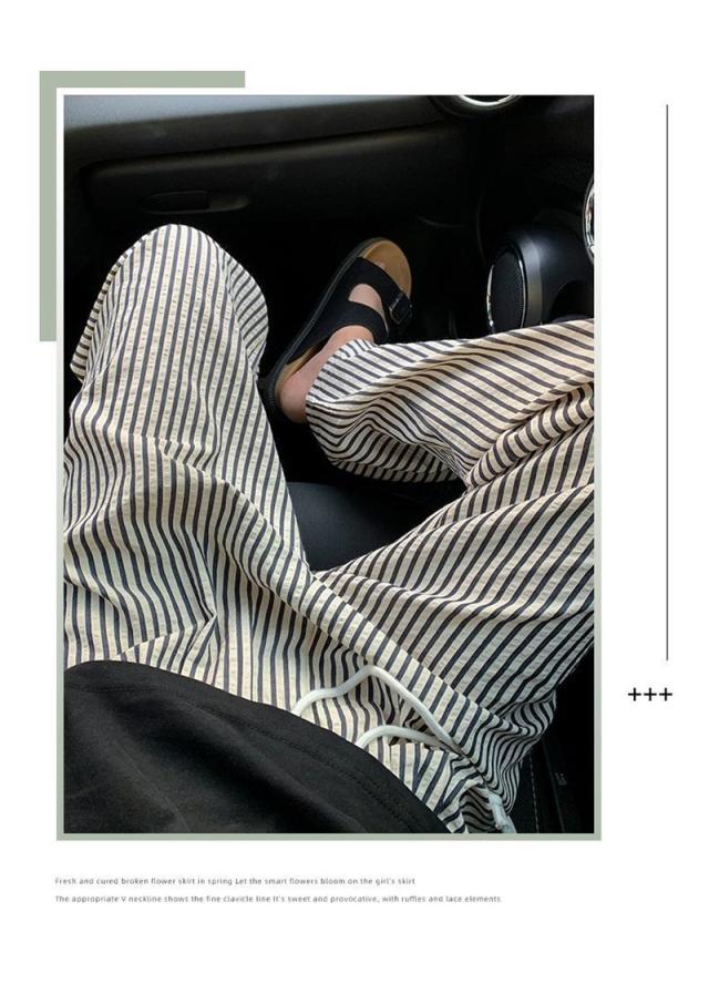 ワイドパンツ レディース ガウチョパンツ ストライプ ウエストゴム カジュアル ロング丈 ゆったり イージーパンツ 長ズボン ボト
