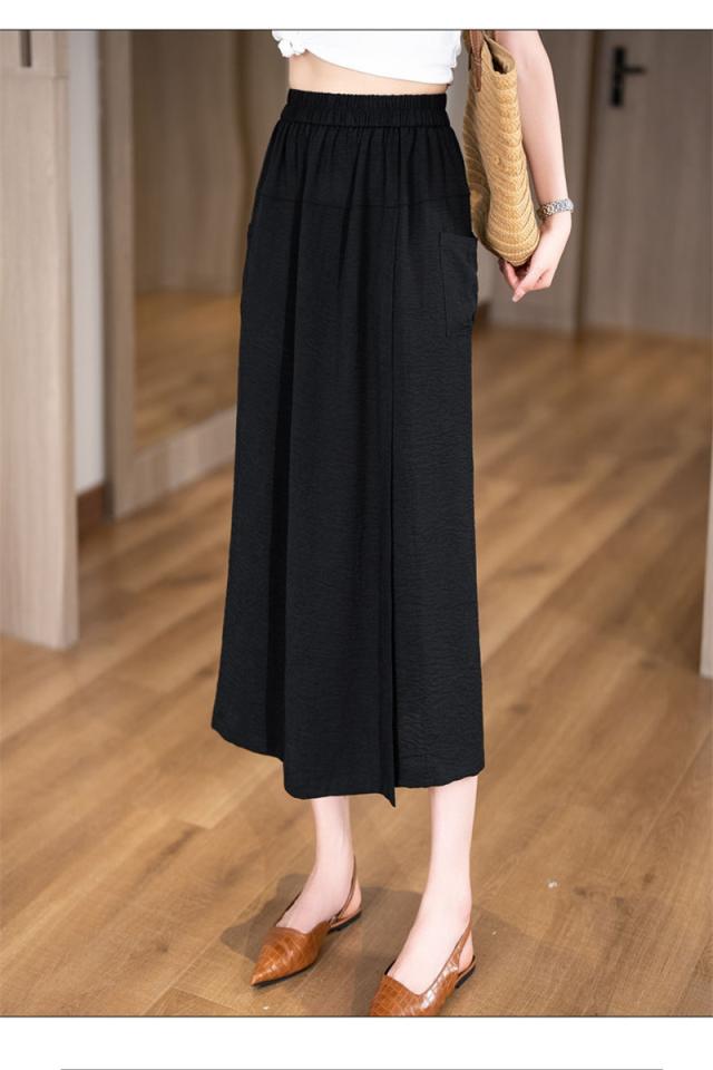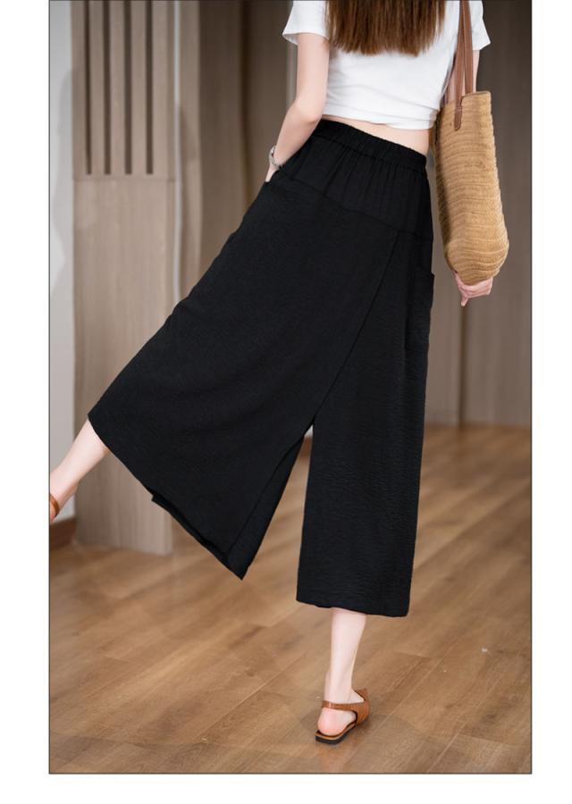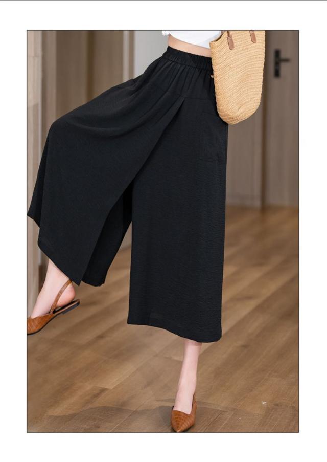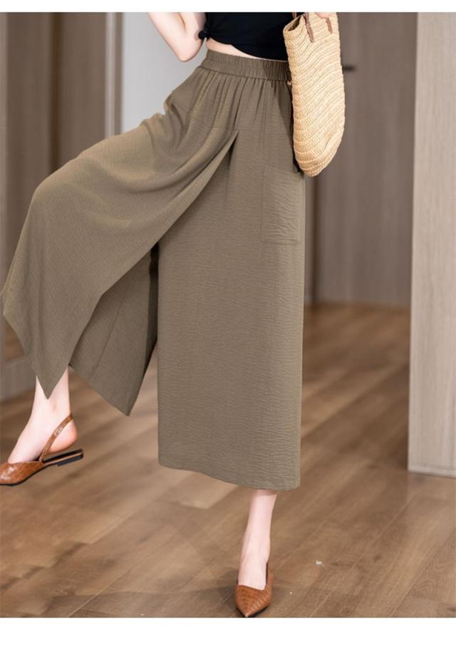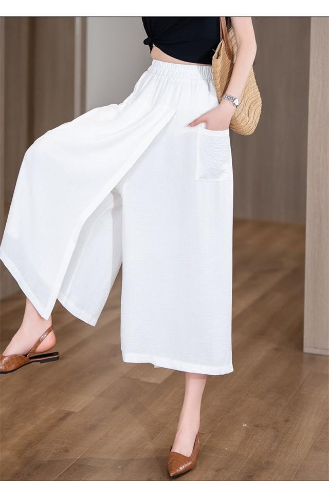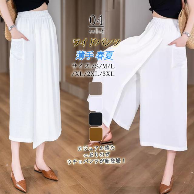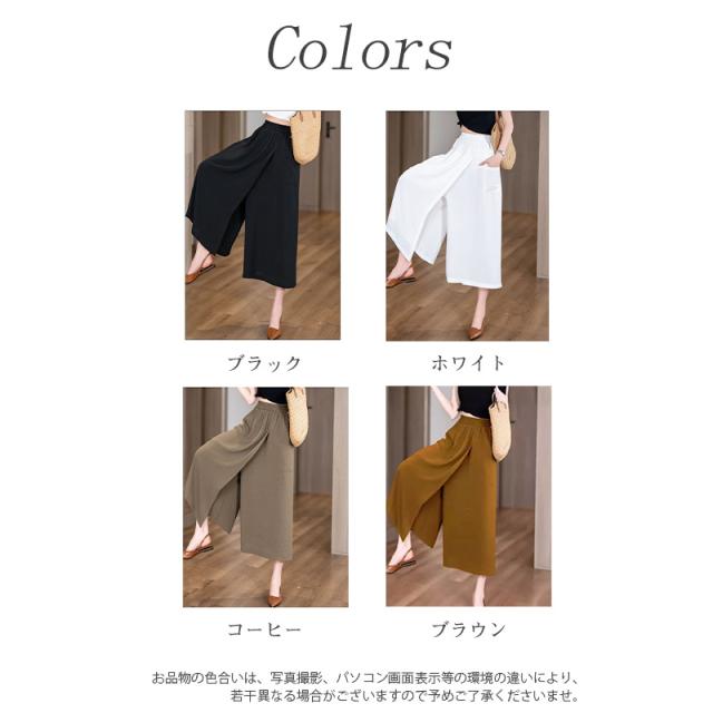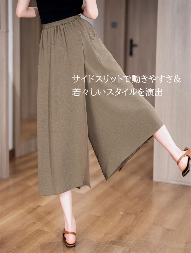 ワイドパンツ レディース ガウチョパンツ 八分丈 スリット スカート風 ハイウエスト 無地 太め ゆったり カジュアル 薄手 着痩
