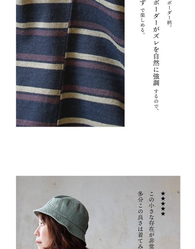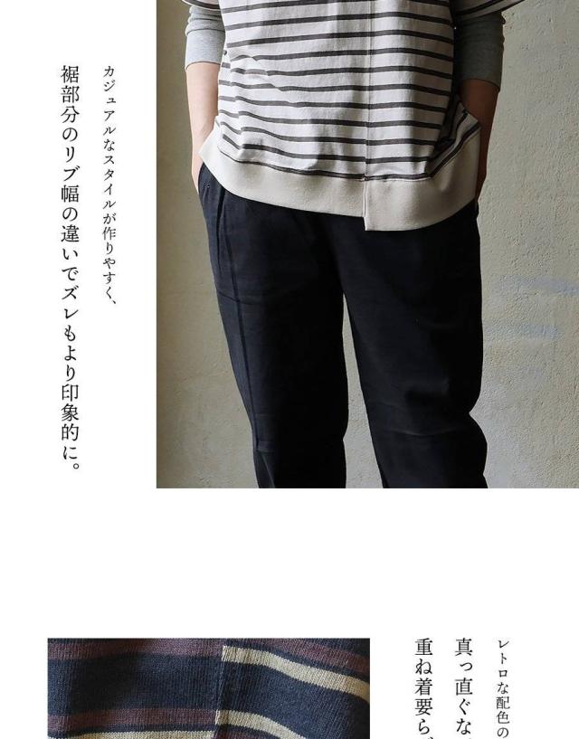 ・レトロな配色のボーダー柄。真っ直ぐなボーダーがズレを自然に強調するので、重ね着要らずで楽しめる。