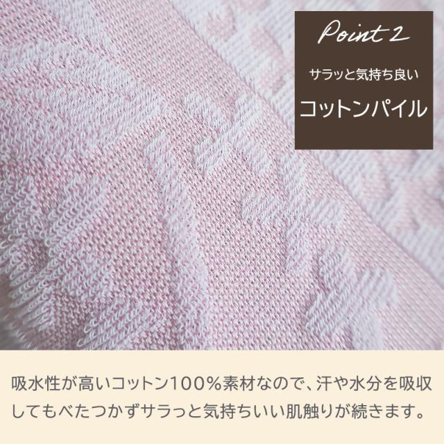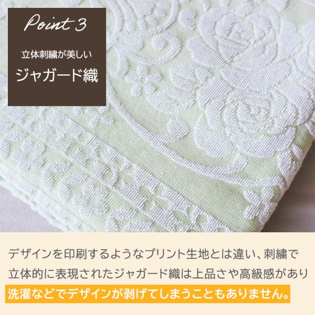 | ■今治産のタオルケット 愛媛県今治市で作られている国産のタオルケットです。軽くて使い勝手のよい薄手タイプです。 ■吸水性に優れた素材 天然素材の綿100%で作られているため、汗や水分吸収してもべたつかず、サラッと気持ちい肌触りが続きます。 ■立体刺繍が美しいジャガード織 刺繍で表現された花柄デザインは美しく高級感があります。プリント生地とは違い、洗濯を繰り返しても、デザインが剥げずに長くお楽しみいただけます。 |