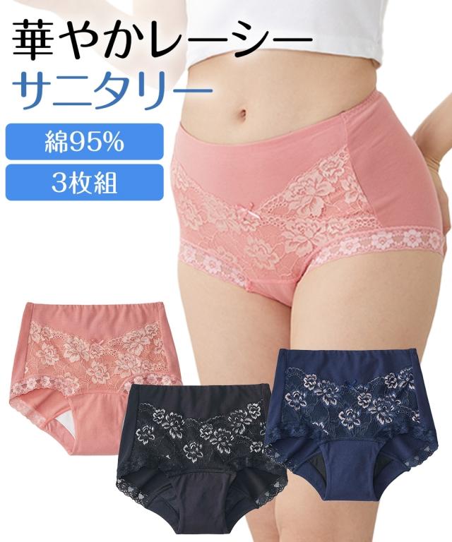 綿混ストレッチ お腹らくちんレーシー深ばき丈サニタリーショーツ昼用3枚組(羽付ナプキン対応)