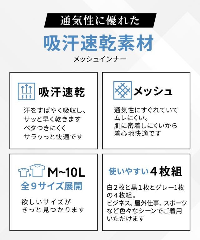 通気性に優れた吸汗速乾素材のメッシュインナー 吸汗速乾 汗をすばやく吸収し、さっと早く乾きます ベタつきにくくサラッっと快適です メッシュ 通気性にすぐれていてムレにくい 肌に密着しにくいから着心地快適です M〜10L 全9サイズ展開 欲しいサイズがきっと見つかります 使いやすい4枚組 白2枚と黒1枚とグレー1枚の4枚組 ビジネス、屋外仕事、スポーツなど色々なシーンでご着用いただけます。
