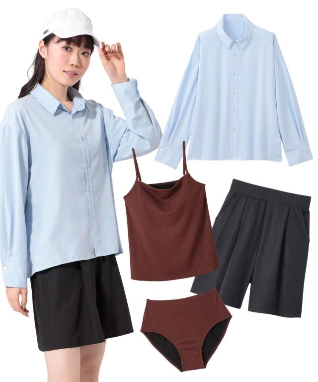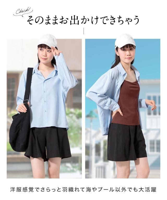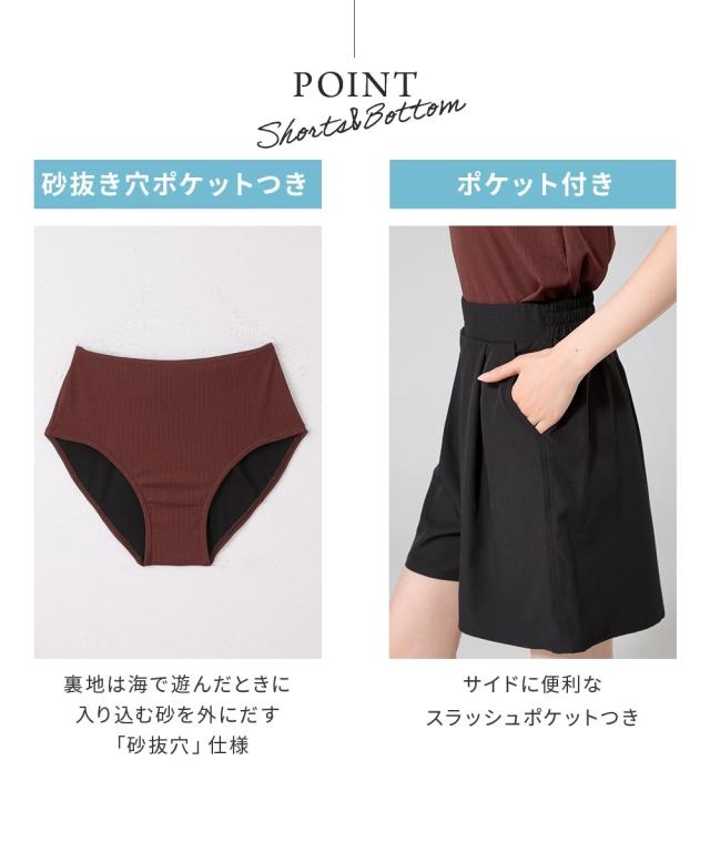 海やプールはもちろん、タウンユースでも活躍する水陸両用4点セット(ラッシュシャツ・パンツ付きタンキニ水着)です。 洋服見えするラッシュシャツは軽やかに羽織れて、ボタンや袖のアレンジで表情の変化も楽しめます。 バストカップは取り外し可能で、手持ちのカップに入れ替えOK。 肌当たりのいいゴムを使用しているので、長時間着てもストレスフリーな着心地です。 タンキニ水着のショーツの裏地には「砂抜穴」を採用し、ビーチで遊んでも砂が溜まりにくく快適。 リブ調の生地が今っぽく、手持ちのトップスと合わせてもおしゃれに。 さらにサイドポケット付きで、お出かけ時のちょっとした小物収納にも便利。 おしゃれと機能性を兼ね備えた、水陸両用の水着セットです。