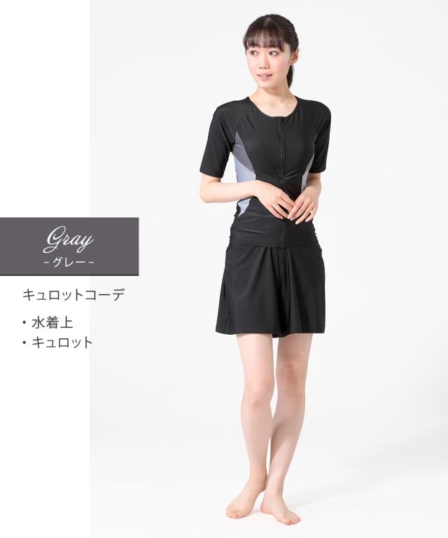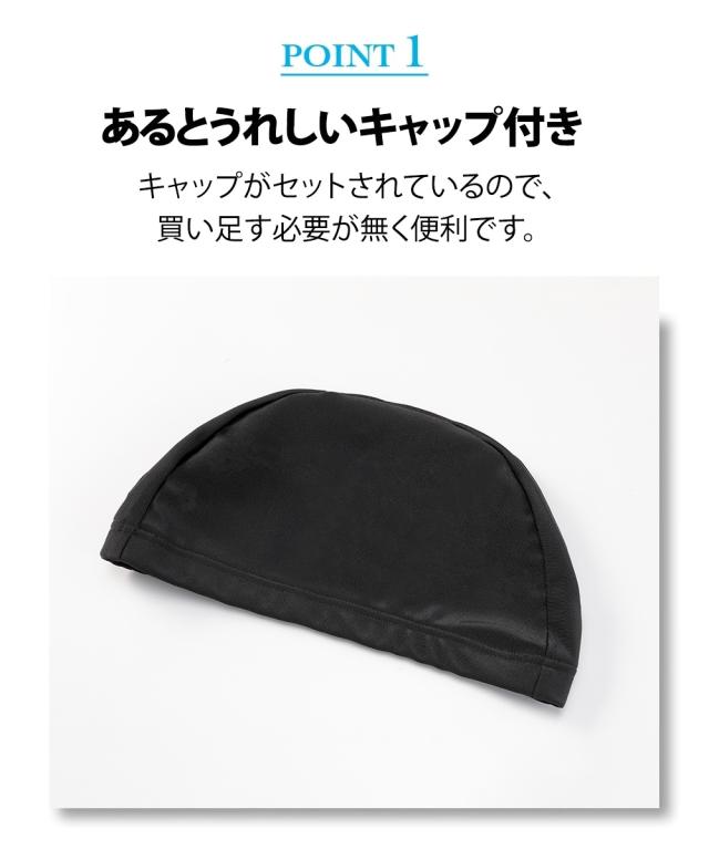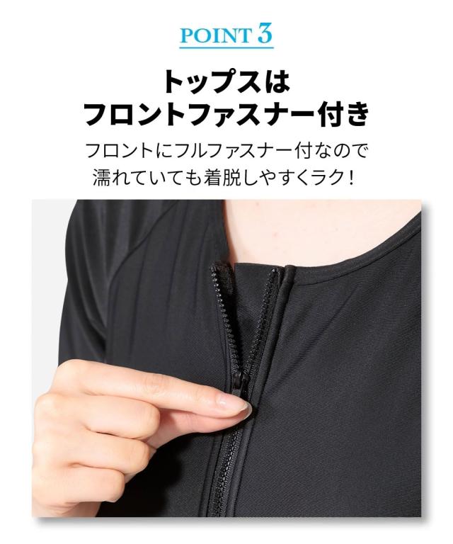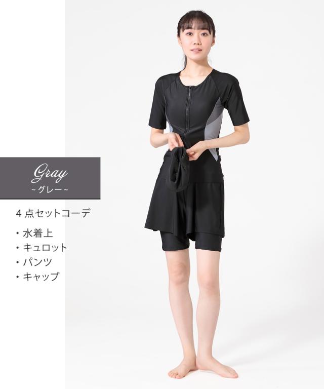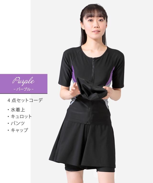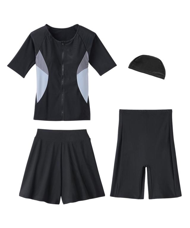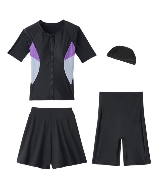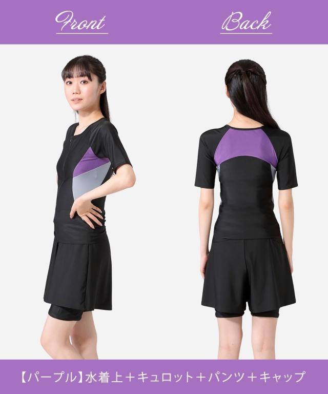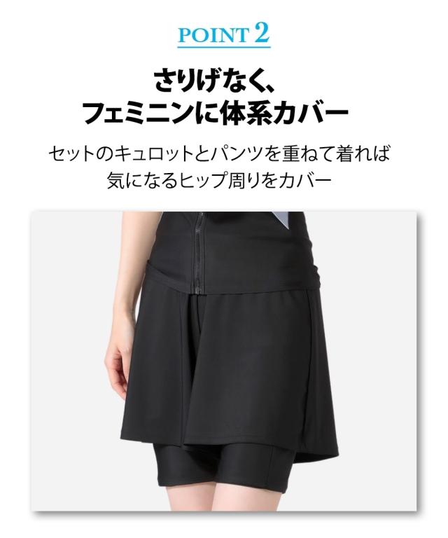トップス・キュロット・パンツ・キャップの4点がセットになったフィットネス水着です。 トップスはめくれにくい仕様で、動きのあるジムのアクアビクスなどにもおすすめ。 フロントファスナーには肌当たりの優しいガード付きで快適に着られます。 フレアキュロットとパンツの組み合わせで、気になるヒップ周りをさりげなくカバー。 きれいなシルエットに仕上がります。 バストカップは取り外しして調整できるので、泳いでいてもフィット感があります。 ジムやプール用にあるとうれしいスイムキャップ付きです。