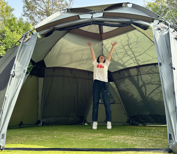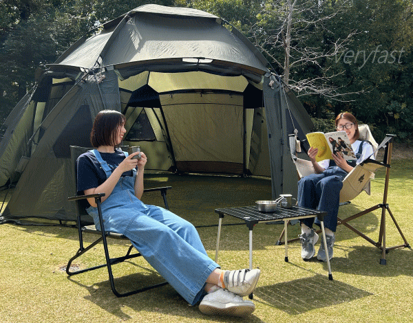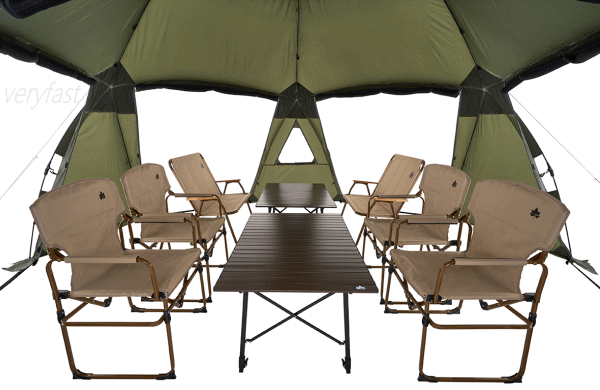 クイックジョイントを伸ばす・折りたたむだけで組立てや撤収ができるQUICK SYSTEMを搭載し設営時間はわずか5分。幅約5m高さ約2.7mの広々空間で大人数キャンプにも最適。8人分のテーブルとチェアをセッティングしてもくつろげます。全方位に設けたメッシュ窓により通気性も抜群。フルクローズや全てオープンにしてスクリーンタープのような使い方もできます。フライシートは防水性、撥水性、難燃性にすぐれ紫外線もカットしてくれます。グランドシート等の別売りオプションアイテムを使用すればさらに居住性アップ。収納や持ち運びにも便利。大型のテントでも出し入れしやすい大開口の収納バッグ付き。■総重量約19.0kg■サイズ約全長565×幅500×高さ270cm■収納サイズ約縦35×横124×高さ35cm■構成:本体、ロープ、ペグ、収納バッグ、ハンマー、小物袋■主素材[フレーム]ソリッドグラスファイバー[フライシート]難燃性バルキーポリ[メッシュ]ポリエステル※耐水圧は摩擦や経年劣化とともに低下していきます。