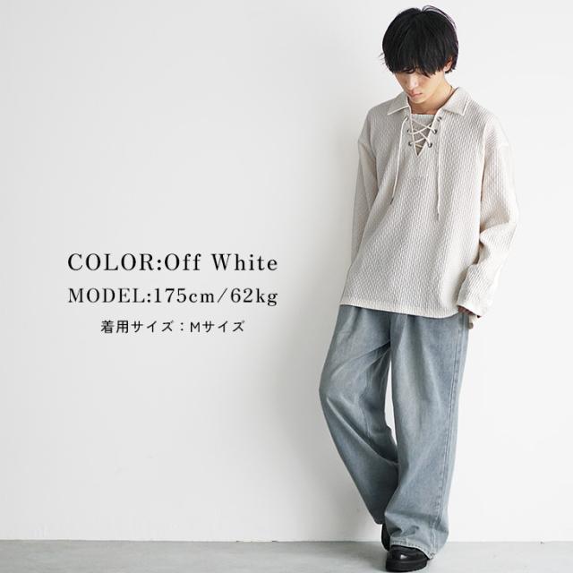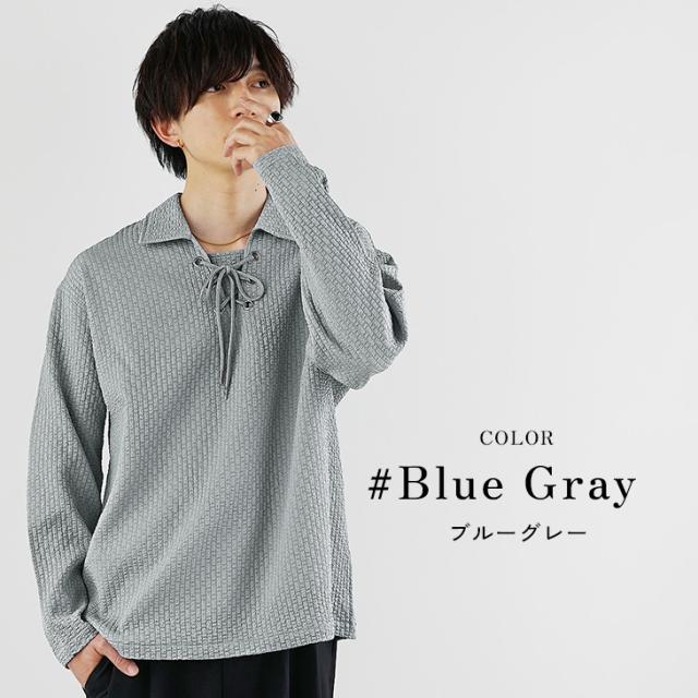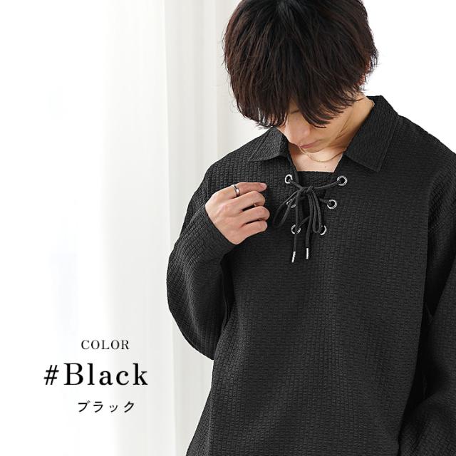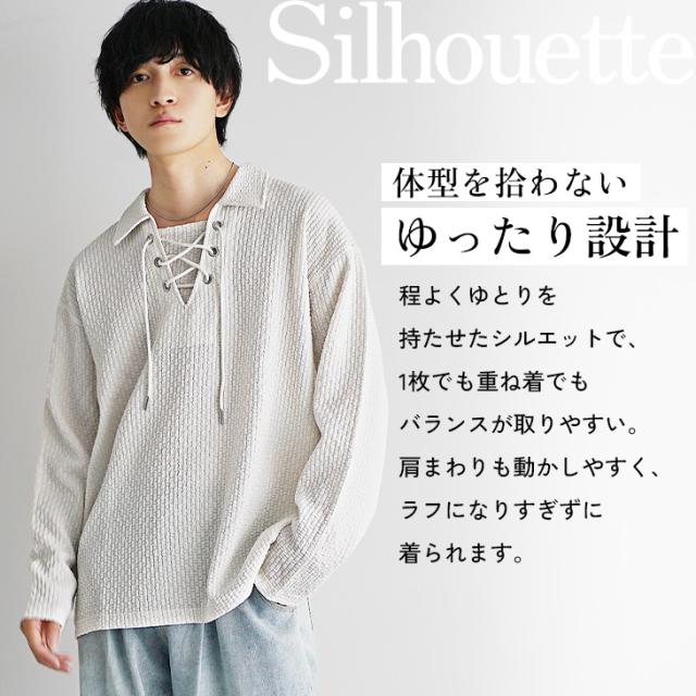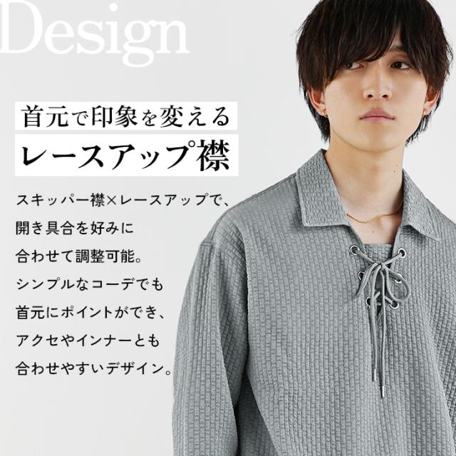 胸元の紐を編み込んだレースアップデザインが特徴的なスキッパーポロシャツ。一般的なスッキッパーポロシャツほど胸元が開いておらず、肌見せを抑えることでヘルシーな大人の色気を表現した1枚です。