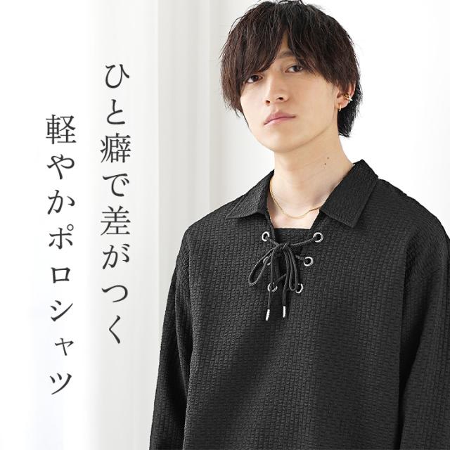 胸元の紐を編み込んだレースアップデザインが特徴的なスキッパーポロシャツ。