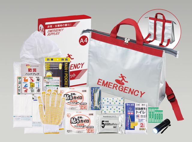 ライトや緊急用ホイッスル、カイロや緊急用トイレなどの災害時に役立つ防災グッズをひとまとめにした一人用防災セット。