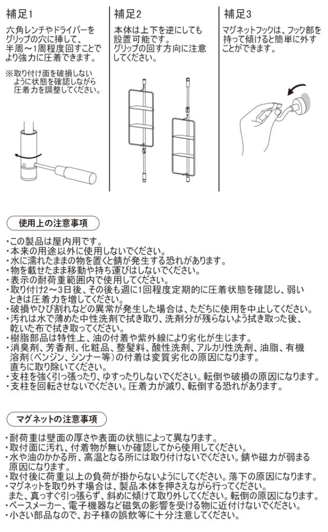 本体:鉄、エポキシ樹脂粉体塗装 樹脂部品:ナイロン樹脂、シリコン樹脂 固定ねじ:鉄・メッキ、ナイロン フック:ネオジム磁石、鉄 |