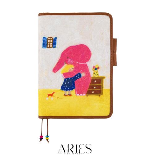 ほぼ日手帳 カズン(A5)手帳カバー 柴田ケイコ/刈谷さん、感動の再会 A5サイズのほぼ日手帳本体用の手帳カバーです。 留め具としても機能するペン差し「バタフライストッパー」が付いています。 柴田ケイコさんの作品で、ゾウの刈谷さんと女の子の再会を描いたシーン。 カバーの縁を囲むこげ茶色のパイピングは、柴田さんの絵を飾るフレームのよう。ふだんから机に置いておけば、目に留まってうれしい気持ちになれそう。
