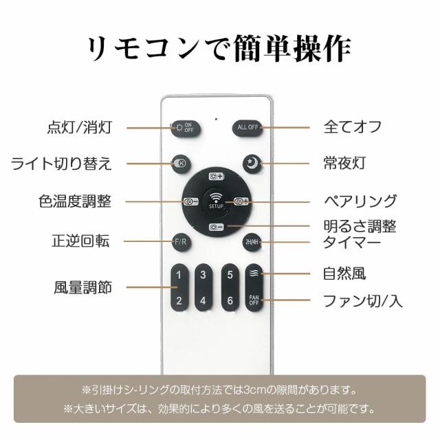 当店のシーリングファンが首振り機能がありません、ご注意くださいませ。ご購入前に天井の配線器具の確認をしてください。天井に穴開け必要がありませんが、配線器具により取付け方が異なります。必ず天井の強度をご確認ください。 ●取付けアタッチメント:引掛埋込ローゼット、角型引掛シーリングボディなど ※引掛けが異なり、またフックも何センチの厚みがあり、シーリングのフックと配線器具の間に隙間が出る場合がございます。 ※適切な羽の高さ:床から220〜250cm ※リモコン付き(単4電池×2個必要※電池は付属していません) |