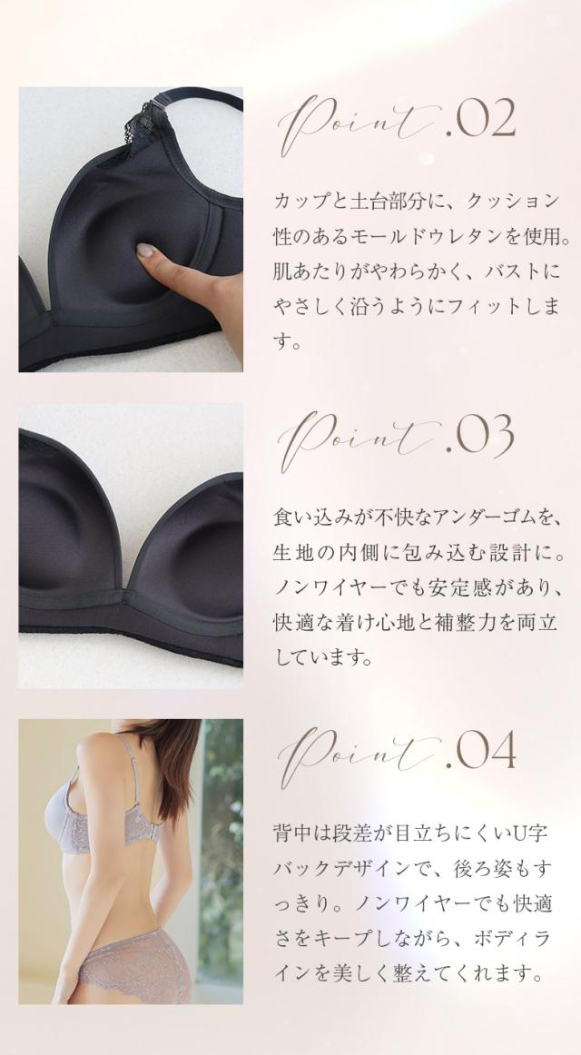 ブラ&ショーツ / 計2点セット ノンワイヤーで楽な着け心地なのに、きちんとスタイルアップ。 サイズごとにカップ設計を調整し、黄金比を意識したボディラインを実現します。 シンプルなデザインで服に響かずお洒落の邪魔をしない。 飾らなくても、無理しなくてもちゃんとキレイ。 新時代のワイヤレスブラシリーズです。 選べる2タイプのショーツは ベーシックなフルバックと、ラインが出にくく快適なレースバックタイプ。 【商品の特徴】 ・バストの広がりを抑え、中央に寄せる設計でふっくら谷間メイク ・サイズに合わせたカップ設計で、バストの黄金比を実現 ・肌面がなめらかな独自のカップ台でストレスフリー ・段差が目立ちにくいU字バックデザイン 【こんな方におすすめ】 ・バストを盛って、全身をすっきり見せたい方 ・ノンワイヤーでも、スタイルアップを叶えたい方 ・自然な高さのあるバストメイクをしたい方 ≫ ギフトラッピングはこちら ≪ | |