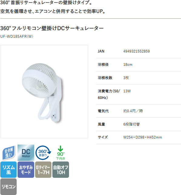 | UF-WD185AFR(W)360°壁掛けDCサーキュレーター フルリモコン付き スペック情報 | |