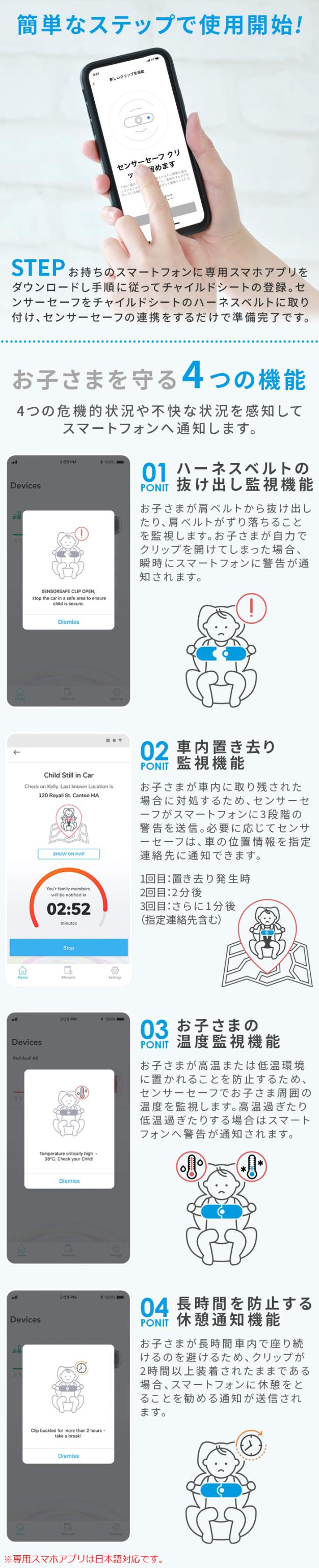 スマートフォンのCYBEXアプリと連携し安全を可視化するセンサーセーフが登場!1.ハーネスベルトの抜け出し監視/2.車内置き去り監視/3.温度監視/4.休憩監視の4つの危機的状況や不快な状況を感知してスマートフォンへ通知します。