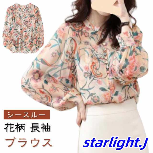 シースルー ブラウス レディース 夏 春夏 シャツ 上品 きれいめ 長袖シャツ 花柄 ピンク 春 スケ感 チュニック フラワー柄 ブラウス トップス ベージュ 花柄ブラウス 透け感 長袖 大人 オフィス カジュアル 20代 30代 40代 50代 ママ 母