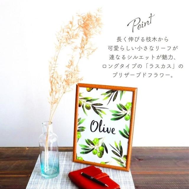 長く伸びる枝木から可愛らしい小さなリーフが連なるシルエットが魅力、ロングタイプの「ラスカス」のプリザーブドフラワー。