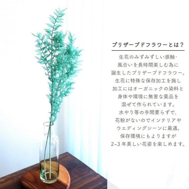 長く伸びる枝木から可愛らしい小さなリーフが連なるシルエットが魅力、ロングタイプの「ラスカス」のプリザーブドフラワー。