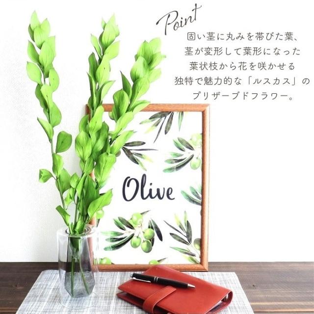 硬い幹に丸みを帯びた葉、茎が変形して葉形になった葉状枝から花を咲かせる独特で魅力的なルスカスのプリザーブドフラワーです。