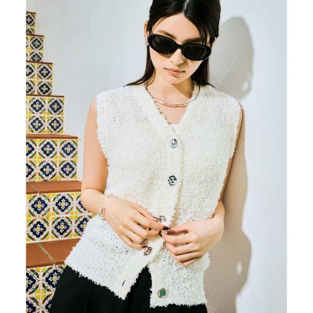 ・フロントのメタル調の釦がアクセント。1枚で着映えするニットベストです。