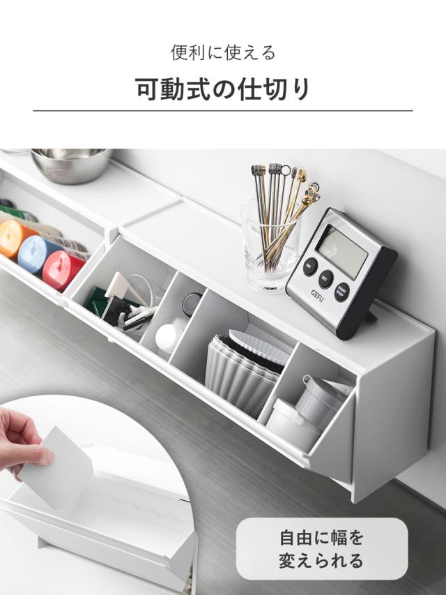 整理に便利な可動式の仕切りが3枚付属しています。2.8cm間隔で自由に取り付けできるので、収納したいものに合わせてカスタマイズできます。