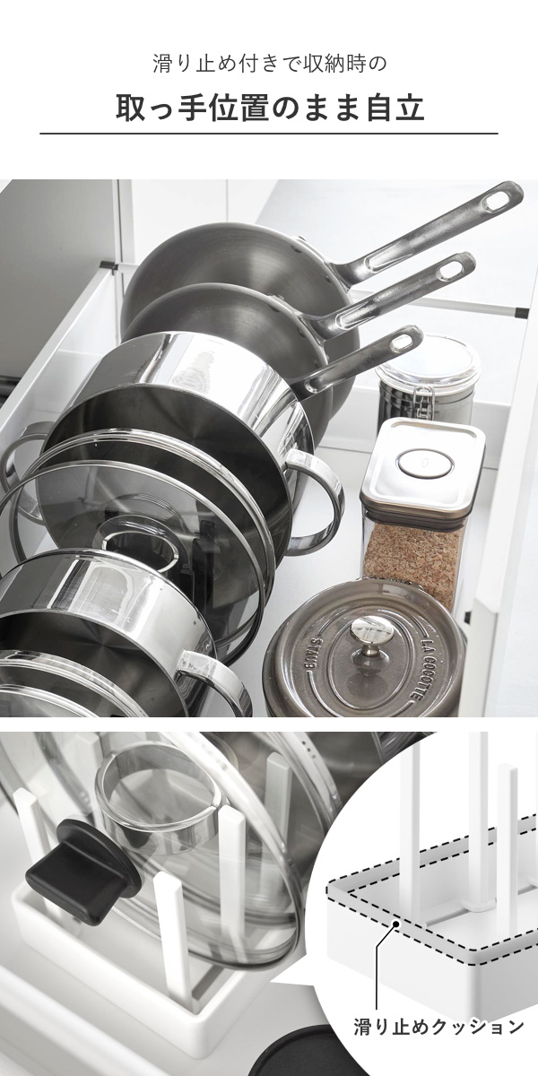 設置面にシリコーン製の滑り止めクッションが付いているので、フライパンなど収納時の取っ手位置のまま自立してくれます。