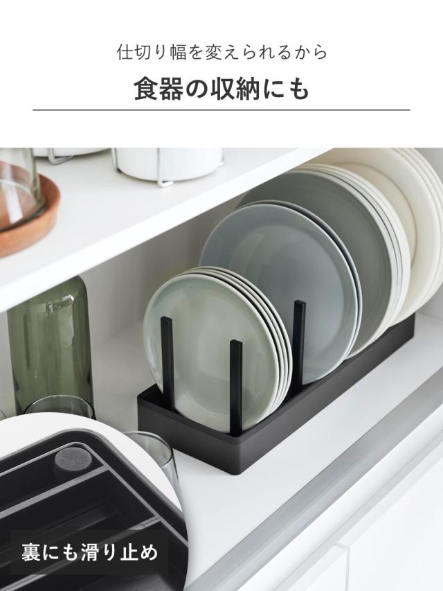 仕切りは収納物のサイズに合わせて調節できます。好みの位置にスライドしてロックするだけで、お皿から鍋まで幅広い収納に使えます。