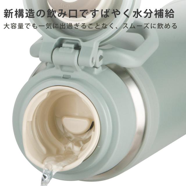 大容量の水筒にありがちな中身がドバっと出てしまうのを防ぐ「フルイドテック構造」の飲み口を採用したマグボトルです。
