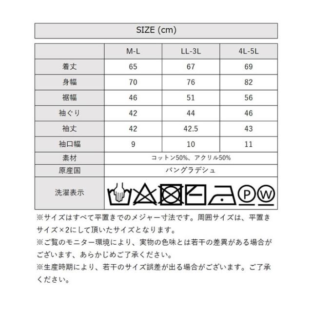 ■サイズ:[M-Lサイズ]着丈:65cm、身幅:70cm、裾幅:46cm、袖ぐり:42cm、袖丈:42cm、袖幅:20cm、袖口幅:9cm [LL-3Lサイズ]着丈:67cm、身幅:76cm、裾幅:51cm、袖ぐり:44cm、袖丈:42.5cm、袖幅:21cm、袖口幅:10cm [4L-5Lサイズ]着丈:69cm、身幅:82cm、裾幅:56cm、袖ぐり:46cm、袖丈:43cm、袖幅:22cm、袖口幅:11cm