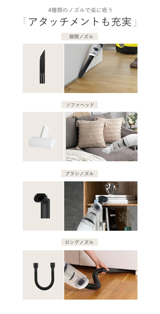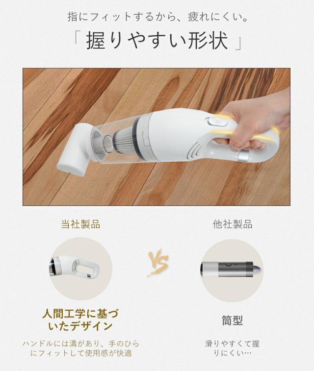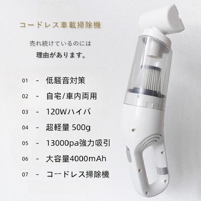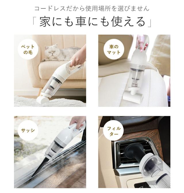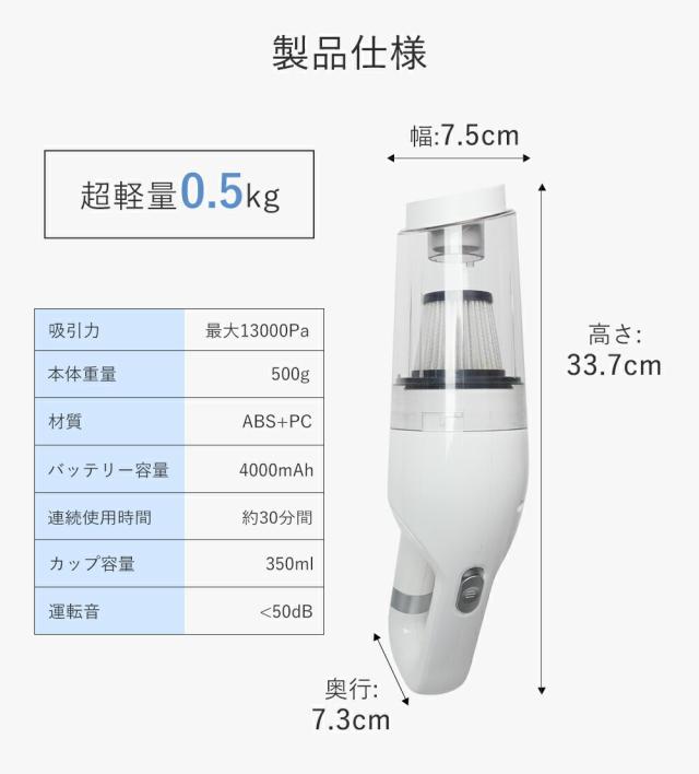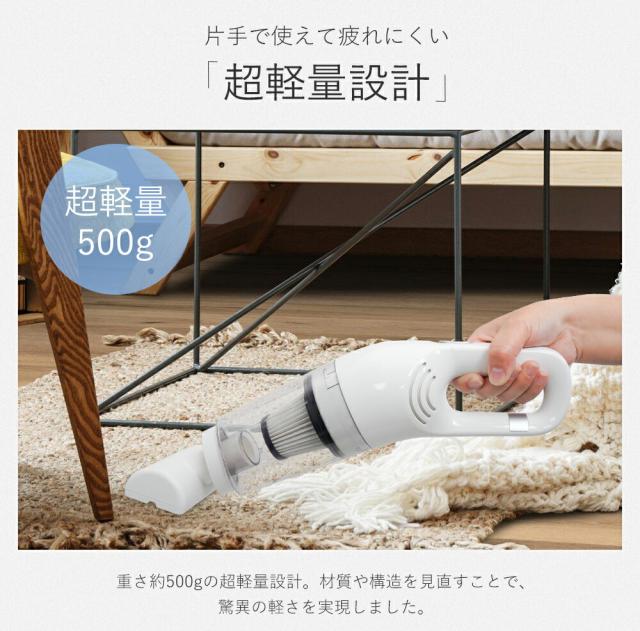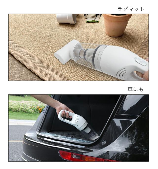 超軽量500g!持ち運び便利、コードレス、片手で簡単に掃除できます。車専用の掃除機だけではなく、お家の片隅に置いて、気になった時にさっと掃除できるのが便利!また、使わない時に車や部屋の隅や押入れなど狭いスペースにも保管できます。