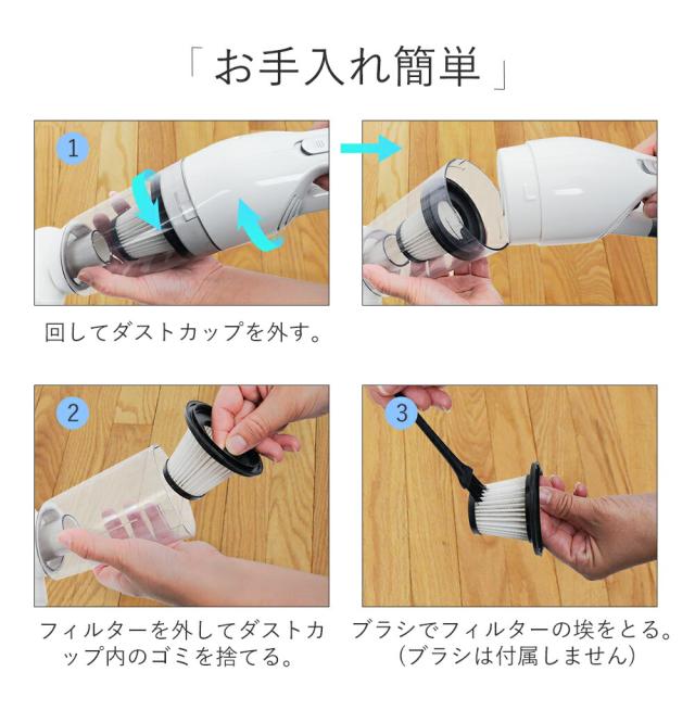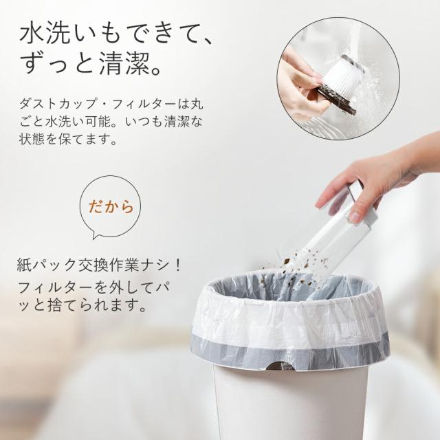 高密度のHEPAフィルターにより吸引されたホコリ、花粉などのゴミをキャッチして、キレイな空気を排出します。ダストカップとフィルターを水で洗えます。定期的なお手入れにをすることで、吸引力を長続きさせることができます。
