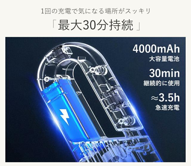 ハンディークリーナーの使用中に充電する必要がないのはとても便利です。コードレスで、掃除する時にゴチャゴチャしているコードからの邪魔がなく、愛車のクリーニングをスムーズに行えます。(ご注意:iPhoneのアダプターと急速充電アダプターを使用しないでください。)