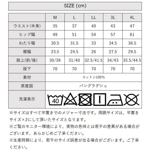 | サイズ | [Mサイズ]ウエスト(半身)35cm・ヒップ幅49cm・わたり幅30.5cm・裾幅23.5cm・前股上30cm・後股上39cm・股下70cm [Lサイズ]ウエスト(半身)37cm・ヒップ幅51cm・わたり幅31.5cm・裾幅24.5cm・前股上31cm・後股上40cm・股下70cm [LLサイズ]ウエスト(半身)40cm・ヒップ幅54cm・わたり幅33cm・裾幅26cm・前股上32.5cm・後股上41.5cm・股下70cm [3Lサイズ]ウエスト(半身)43cm・ヒップ幅57cm・わたり幅34.5cm・裾幅27.5cm・前股上34cm・後股上43cm・股下70cm [4Lサイズ]ウエスト(半身)47cm・ヒップ幅61cm・わたり幅36.5cm・裾幅29.5cm・前股上35.5cm・後股上44.5cm・股下70cm |