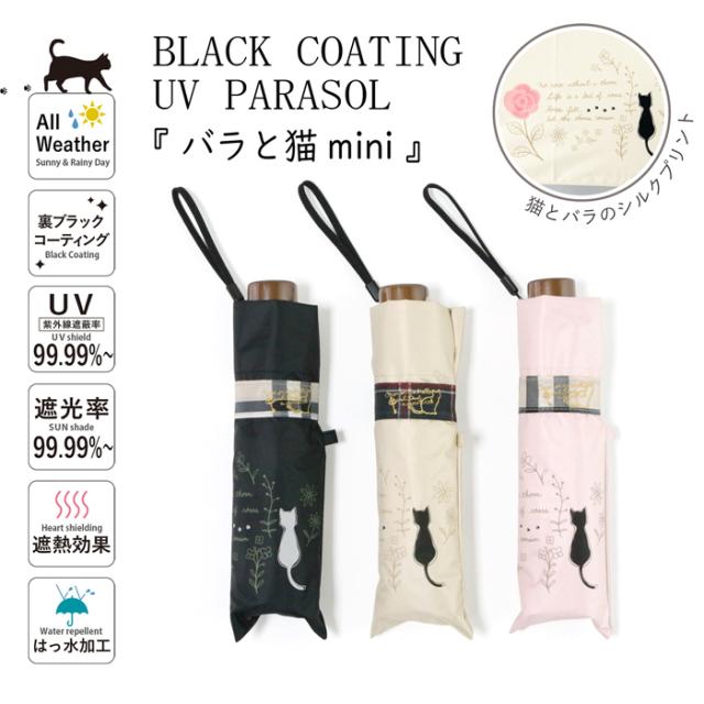 【折傘】 晴雨兼用 折りたたみ 日傘 雨傘 折り畳み傘 50cm バラと猫 ミニ シルエット ねこ 耐風 ネコ 猫薔薇 遮光 遮熱 ブラックコーティーング キッズ 子供 通学おしゃれ かわいい 可愛い MKN