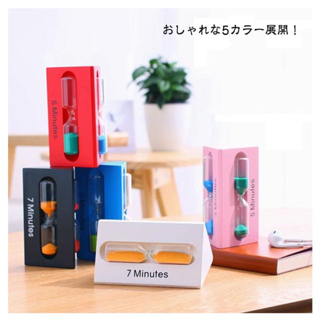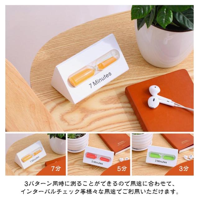 | 砂時計だけど使わくても置いておいてインテリアとしてもオススメ!【3分/5分/7分】 3パターン同時に測ることができるので用途に合わせて、インターバルチェック等様々な用途でご利用いただけます。 音もなく集中したい時に大活躍! おしゃれな5カラー展開! 勉強や歯磨き、キッチンからエクササイズ等さまざまなシーンで活躍します。 | |