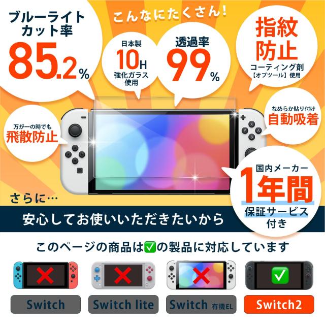 最新機種 Nintendo Switch 2 ガラスフィルム ブルーライトカット 目に優しい 日本製 お子様に かんたん 安全 安心 透明ガラス 85.2%カット 保護 強化ガラス 旭硝子製 保証 OLED スイッチ スウィッチ ニンテンドー おまけ付き 防水ケース ポイント消化 送料無料