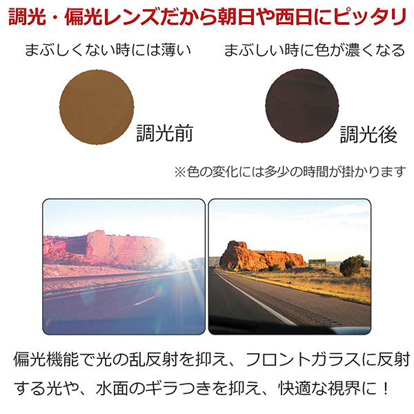 運転中、朝日や西日で「あっ!」っと思った事ありませんか?見やすいように薄い色のサングラスでは、朝日や西日の時に、眩しくて見えにくい…色の濃い物だと眩しくない時に見えづらい…そんな悩みを解消してくれるのが「調光・偏光サングラス」