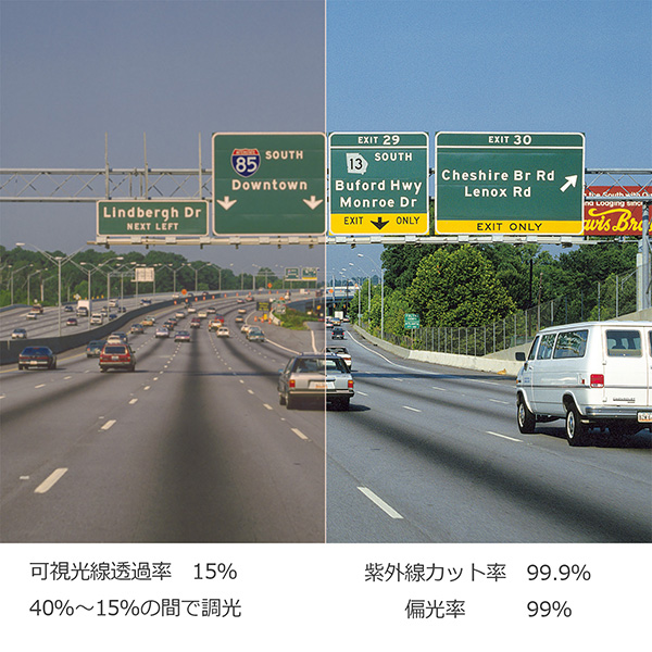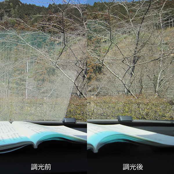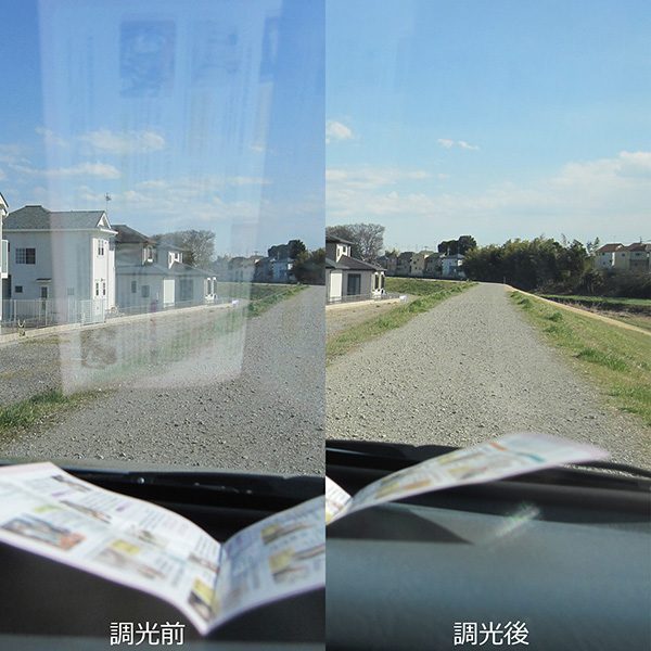 調光・偏光加工を施しているこのレンズは、紫外線が強く眩しい時に色が濃くなり、紫外線が少ない時には薄くなるので、朝日や西日対策に便利な逸品。