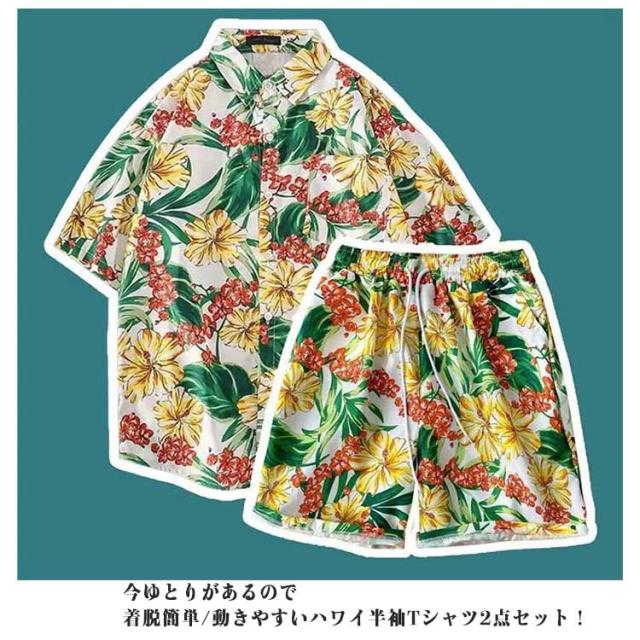 夏 ビーチシャツ 半袖 上下 アロハ アロハシャツ セットアップ 夏 ファッション 上下セット カジュアルウェア アロハ 柄シャツ メンズ アロハ 膝上 おしゃれ アロハ柄 花柄 総柄 ボタニカル柄 部屋着 夏服 ショートパンツ 花火 リゾート 連休 旅行