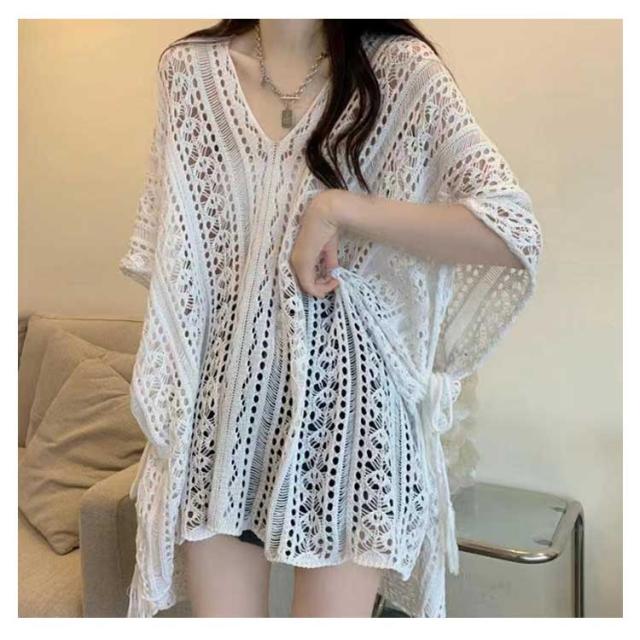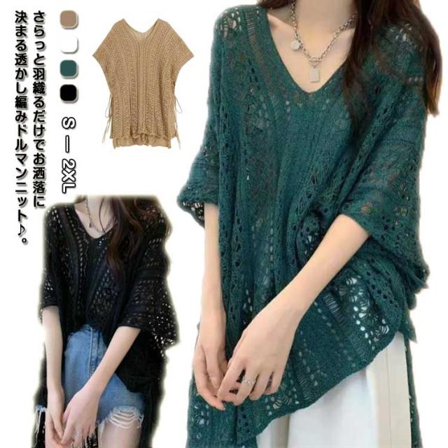 透かし編み ドルマンニット サマーニット レディース トップス 五分袖 Vネック メッシュニット 体型カバー ロングニット 重ね着 レイヤード 春夏 薄手 プルオーバー ゆったり 涼しい シースルー 冷房対策 日焼け防止