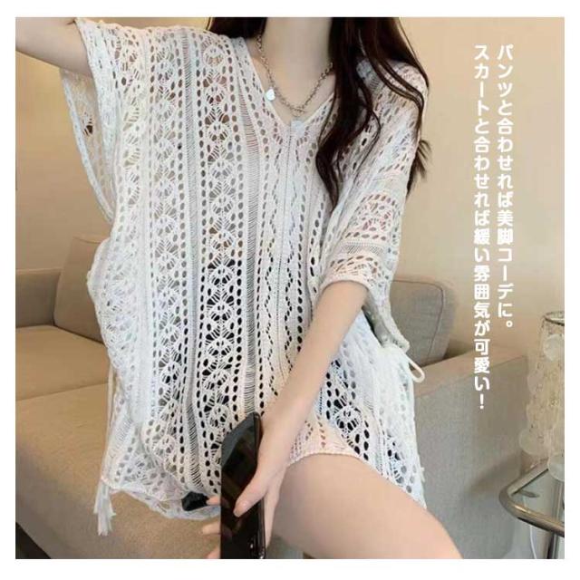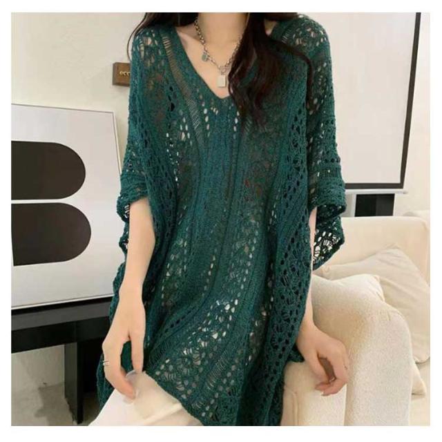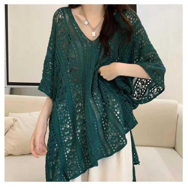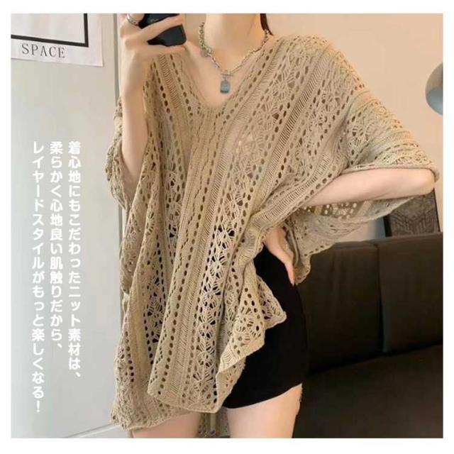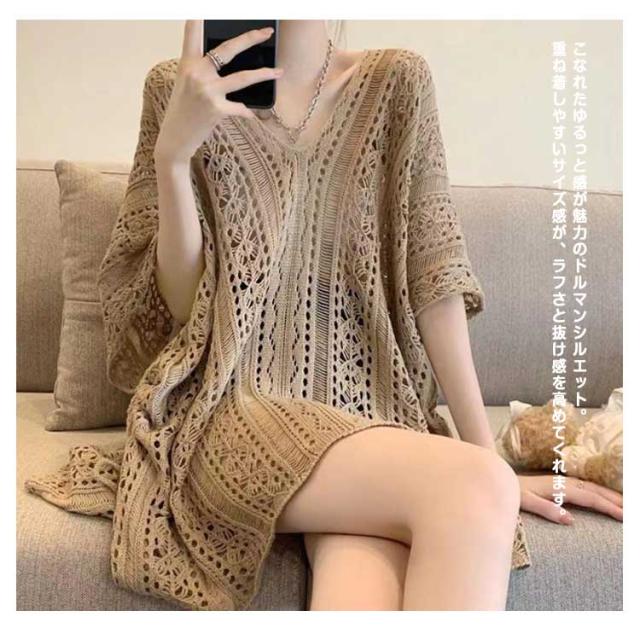 透かし編み ドルマンニット サマーニット レディース トップス 五分袖 Vネック メッシュニット 体型カバー ロングニット 重ね着 レイヤード 春夏 薄手 プルオーバー ゆったり 涼しい シースルー 冷房対策 日焼け防止