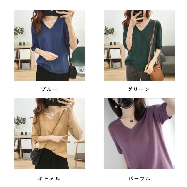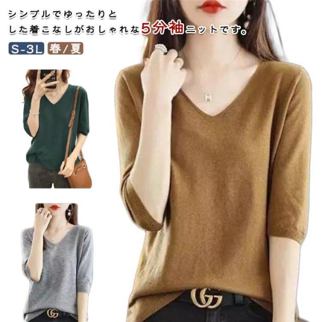 サマーニット Vネック 大人 半袖 五分袖 トップス 無地 レディース ニット ニット 秋 冬 カジュアル 体型カバー 春夏 シンプル オフィス オフィスカジュアル 20代 30代 40代 50代