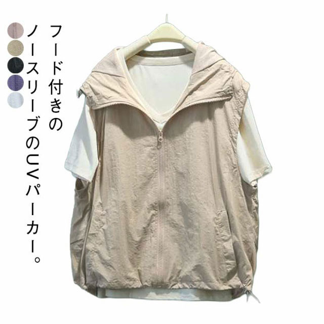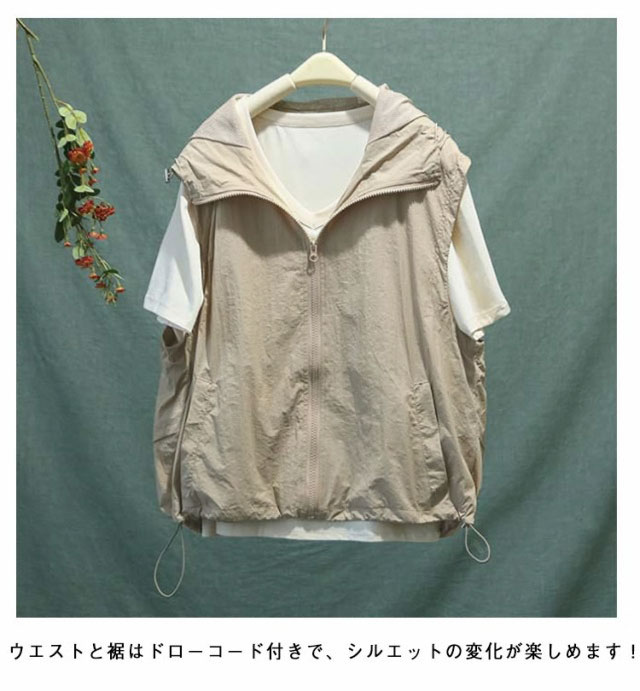 ベスト パーカー ジレ ノースリーブ ライトアウター 着回し 羽織り アウター 前開き フード付き レイヤード ジャケット レディース 無地 トップス 薄手 春 夏 大人 ひんやり 涼しい 前開き 軽量 通気 速乾 お釣り 撮影 登山服